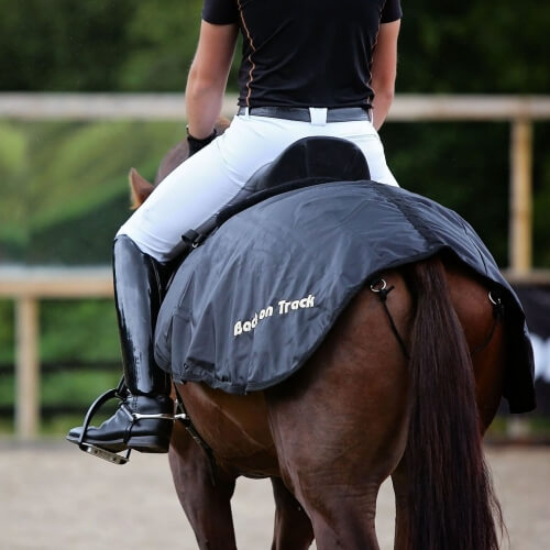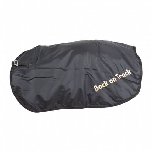 The Back on Track Loin Rug / Quarter Rug can be used during exercise. It has an interior polypropylene fabric lining infused with melted ceramic fibres and an exterior fabric made of polyester. The rug is breathable and can take a certain amount of water or dampness. The rug is equipped with a tail strap and a back tie. The rug is attached to the saddle with a simple clasp.