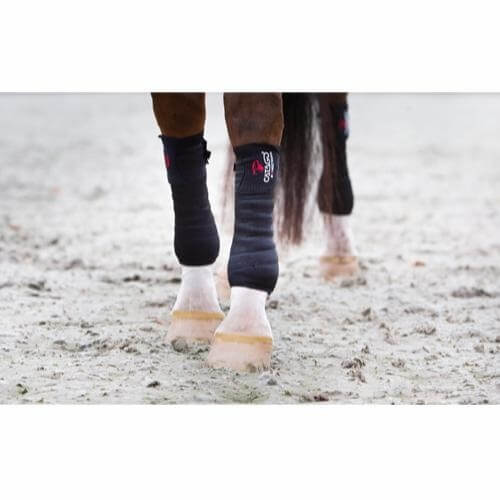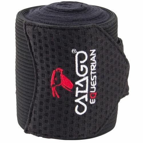 4 x Pack of Catago Fir-Tech Exercise Bandages. One size fits all exercise bandages which have ceramic particles woven in, which reflect the horse’s body heat by way of electromagnetic infrared heat radiation, which penetrates the tissue and expands the blood vessels in the horse. This gives an improved blood flow, as well as counteracting tension and fatigue in the legs. The bandages have velcro closures.