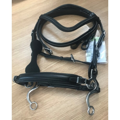 A Calli Bitless Bridle and Reins with a Music Hackamore Fixing by FRA. The Calli Music Hackamore Bitless Bridle mostly works with mild pressure being applied to the nose and poll area when there is slight tension applied through the rein.