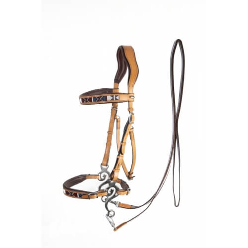 The Western look ‘Esprit’ Hackamore Bitless Bridle and Reins by FRA supplied with a music hackamore shank. The hackamore bridle mostly works with mild pressure being applied to the nose and poll area when there is slight tension applied through the rein.