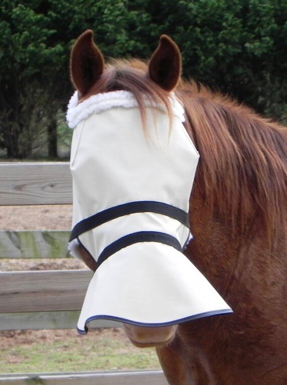 Nag Horse Ranch Full Face Eye / Nose Protection Shade / Fly Mask. Eye and Nose protection with 90% UV protection. Beige in colour and most of the necessary ends of the shade are sheepskin lined for comfort. The shade is designed to flare away from the horses face for comfort and horses can graze and drink easily.