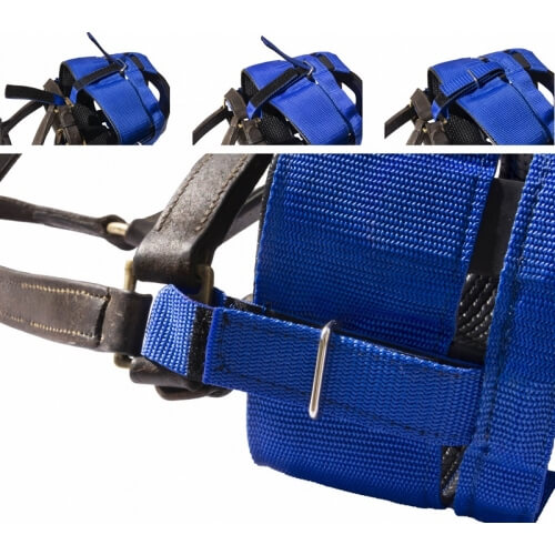 The Zephyr Muzzle attaches to your existing headcollar with velcro straps. We strongly recommend that you use this product with a headcollar with a safety breakaway strap.