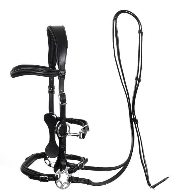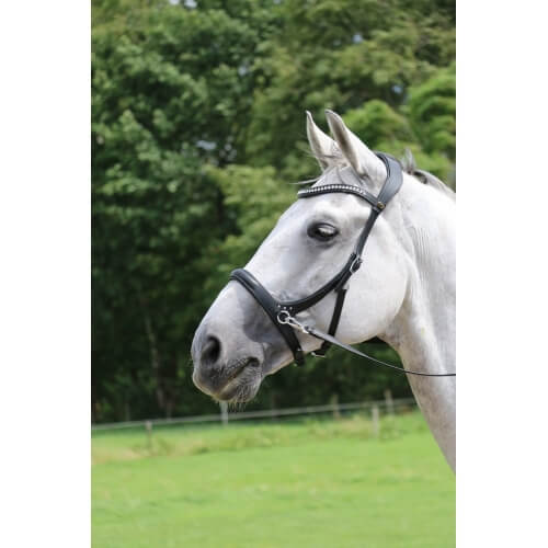 A Calli Bitless Bridle and Reins with a Butterfly Hackamore Fixing by FRA. The Calli Butterfly Hackamore Bitless Bridle mostly works with mild pressure being applied to the nose and poll area when there is slight tension applied through the rein.