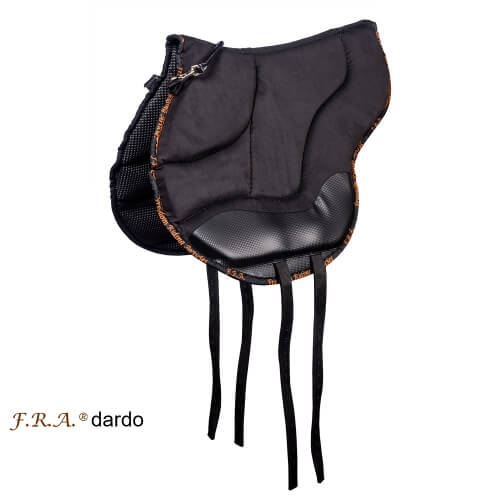 A Dardo Bareback Saddle Pad for Horses and Ponies by FRA. The Dardo bareback pad has a suede top and sympanova bottom. It is beautifully made and very comfortable for both you and your horse. Anatomically shaped and built up over the front wither area for added comfort for you and your horse.