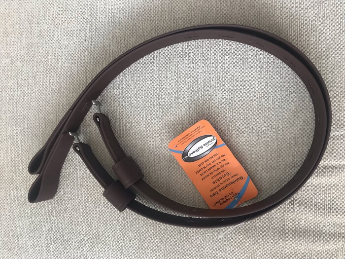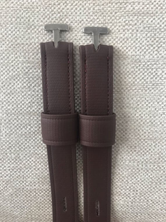 Genuine Heather Moffett Synthetic Biothane Stirrup Leathers / Webbers. Will easily fit to most saddles with a t bar stirrup setting. Greatly reduces the bulk under the rider’s leg.