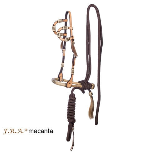 A Macanta Bosal Bitless Bridle Complete With Mecate Rope Rein by FRA. The Macanta Bosal Bitless Bridle Complete With Mecate Rope Rein (Brown Rein) mostly works with mild pressure being applied to the nose area when there is slight tension applied through the rein.