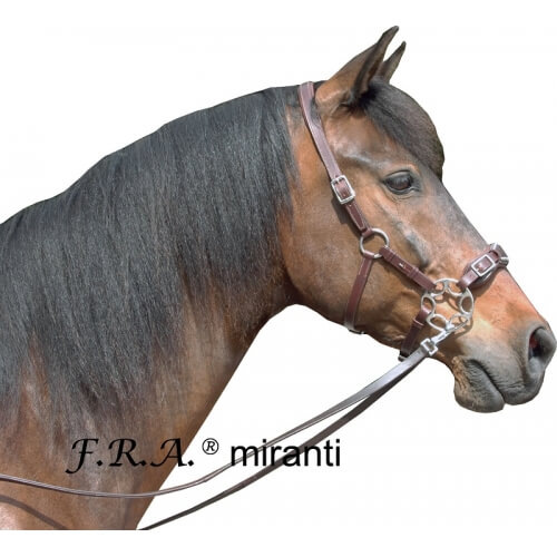 A Miranti Bitless Bridle with a Star Sidepull Fixing by FRA. The Miranti Star Bitless Bridle mostly works with mild pressure being applied to the nose and cheek area when there is slight tension applied through the rein.