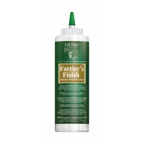 Disinfect and protect in one step. Farrier’s Finish is a liquid topical hoof dressing that combats the “hoof eating” bacterial and fungal invasions which cause white line disease, thrush, and poor hoof quality. It is also a conditioner that supports correct hoof capsule moisture balance in excessively wet or dry conditions. It helps to keep hooves and skin healthy.