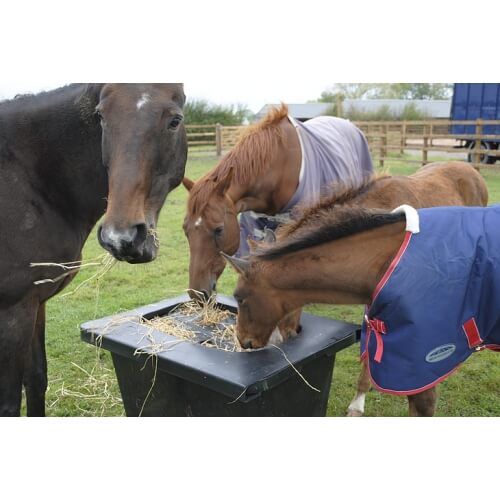 Hard wearing frost resistant plastic and designed for outdoor use to minimise hay wastage and to promote healthy eating.